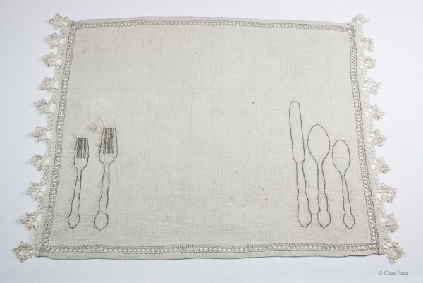 Place Setting #1 Place Setting #1, 2012 Linen placemat, human hair 25 x 18″ <Previous< >Next> Back to Heirlooms Photography by Abby Johnson Like Loading...